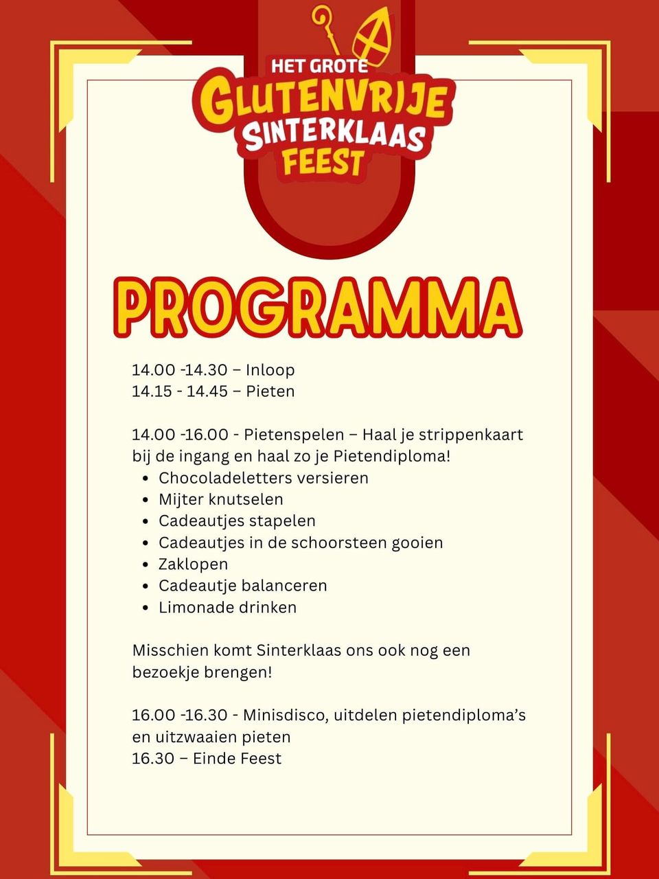 Kom naar het gezellige glutenvrije Sinterklaasfeest met leuke pietenspelletjes, mini disco en chocoladeletters versieren, inclusief een meet & greet met Sinterklaas.