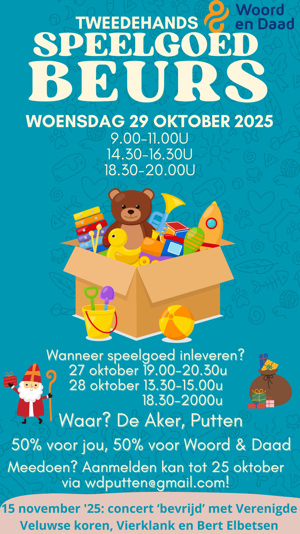 Speelgoed kan ingeleverd worden bij De Aker in Putten op 27 oktober 19:00 - 20:30 uur. En op 28 oktober 13:30 - 15:00 uur en 18:30 - 20:00 uur. Het is dan 50% voor jou, 50% Woord & Daad.