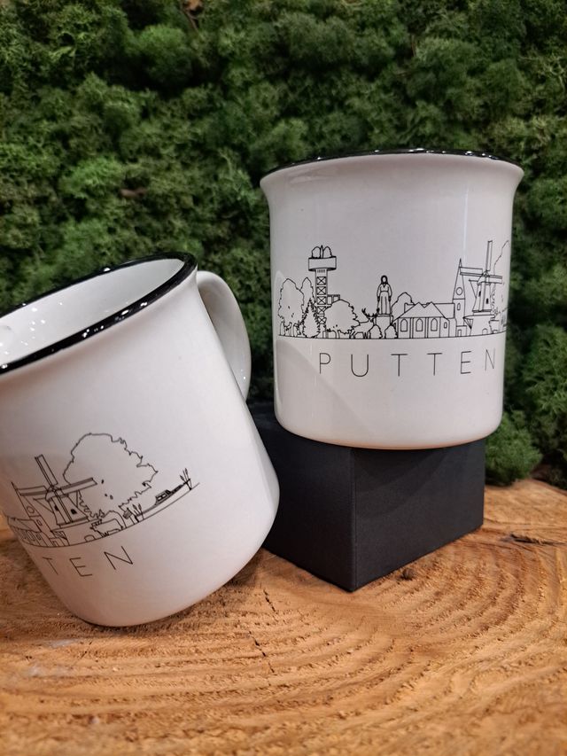 Daarom zijn nu bij ons in de winkel producten te verkrijgen met daarop de skyline van Putten. Je ziet in het ontwerp o.a. de bostoren, de Vrouw van Putten, de Oude Kerk en Molen 't Hert. Ook is de diversiteit van de natuur in Putten terug te zien in de skyline.
