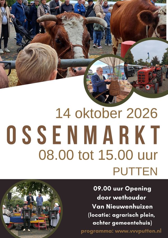 Tijden van vroeger herleven op deze dag. Het is in deze Veluwse plaats dan weer Ossenmarkt. Deze traditionele najaarsmarkt is al eeuwen oud. De aanleiding tot een bezoek aan de vroegere "beestenmarkt" mag in de loop der jaren veranderd zijn, de "mart" trekt nog altijd duizenden bezoekers. De Ossenmarkt blijft een gezellige dag om heen te gaan. Traditionele najaarsmarkt met o.a. een braderie, een vlooienmarkt, oude ambachten en kinderattracties. Het terrein achter het gemeentehuis staat in het teken van de boerderij, waarbij weer mooie grote landbouwwerktuigen te zien zullen zijn.