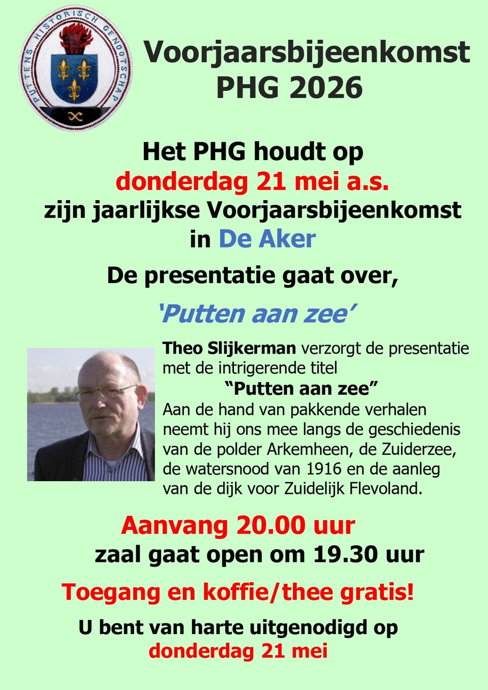 Het Puttens Historisch Genootschap houdt op donderdag 21 mei a.s. zijn jaarlijkse Voorjaarsbijeenkomst.