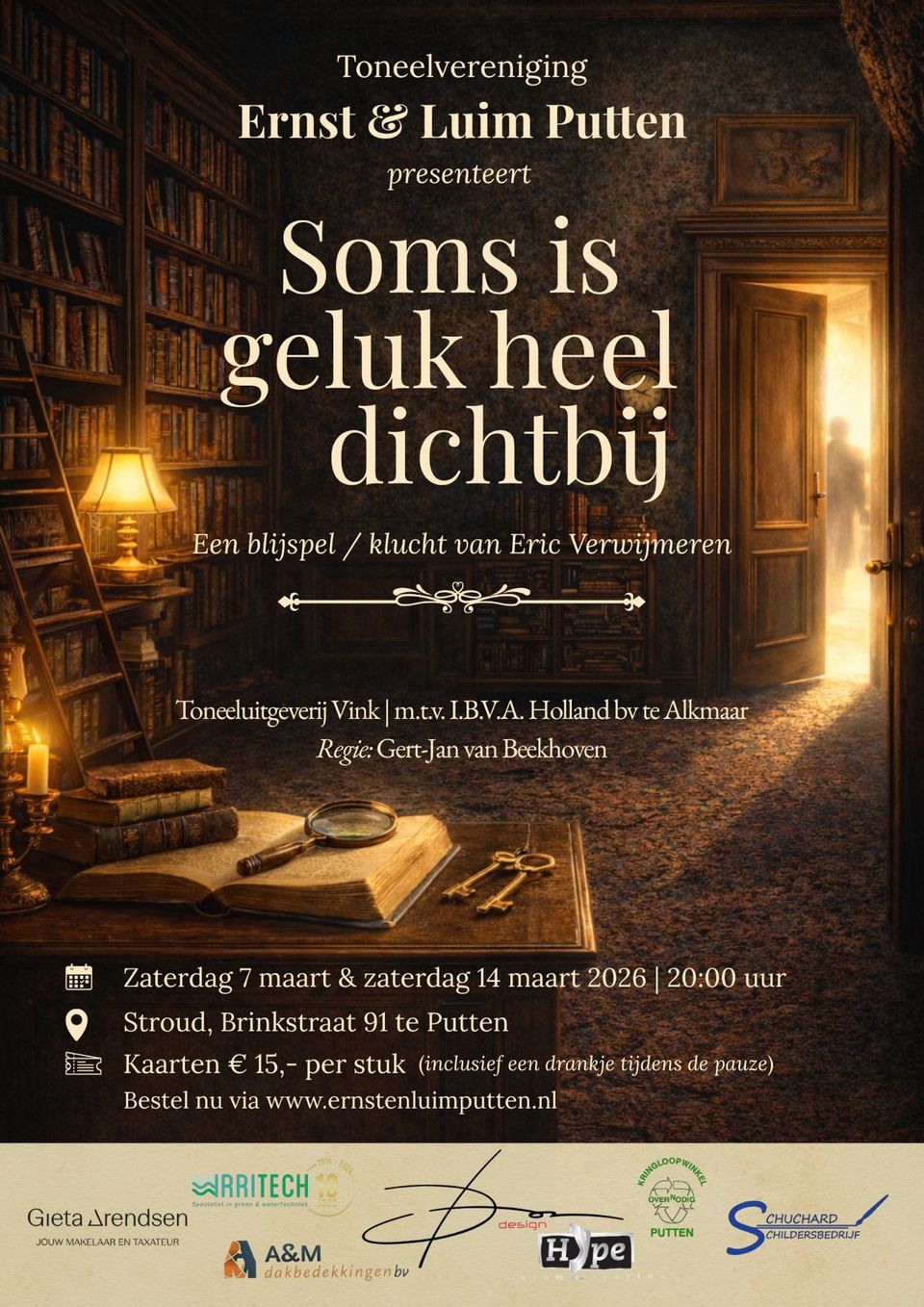 Toneelvereniging Ernst & Luim uit Putten speelt in theater Stroud, de klucht van Eric Verwijmeren 'Soms is geluk heel dichtbij'. De regie is in handen van Gert-Jan van Beekhoven. Bestel nu je kaarten via www.ernstenluimputten.nl.