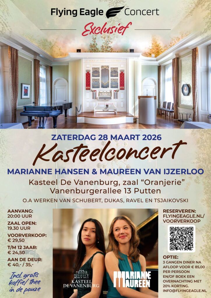 Beleef een sprankelende muzikale middag in de 'Oranjerie' bij Kasteel De Vanenburg tijdens het concert van het veelgeprezen pianoduo Marianne Hansen en Maureen van IJzerloo. Ze brengen onder ander werken van Schubert, Dukas, Ravel en Tsjaikovski ten gehore.